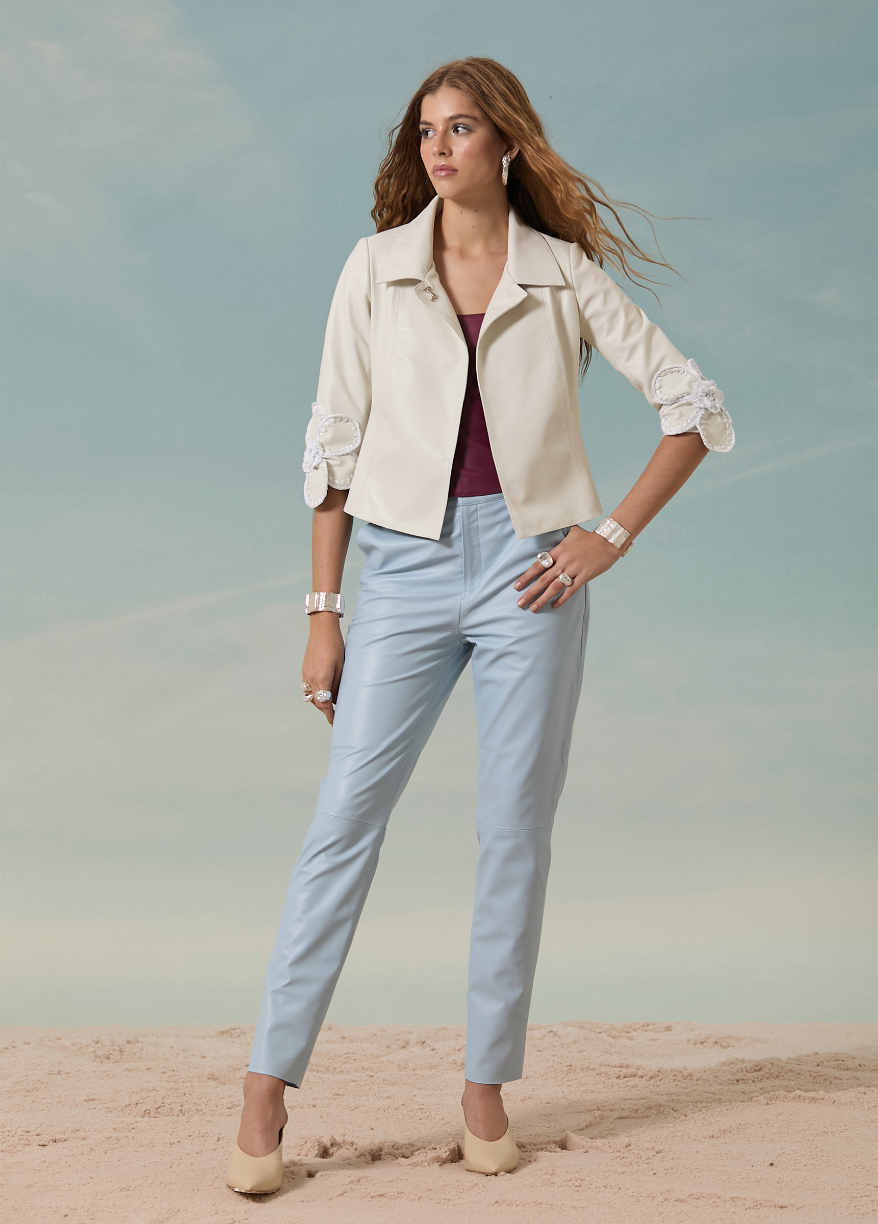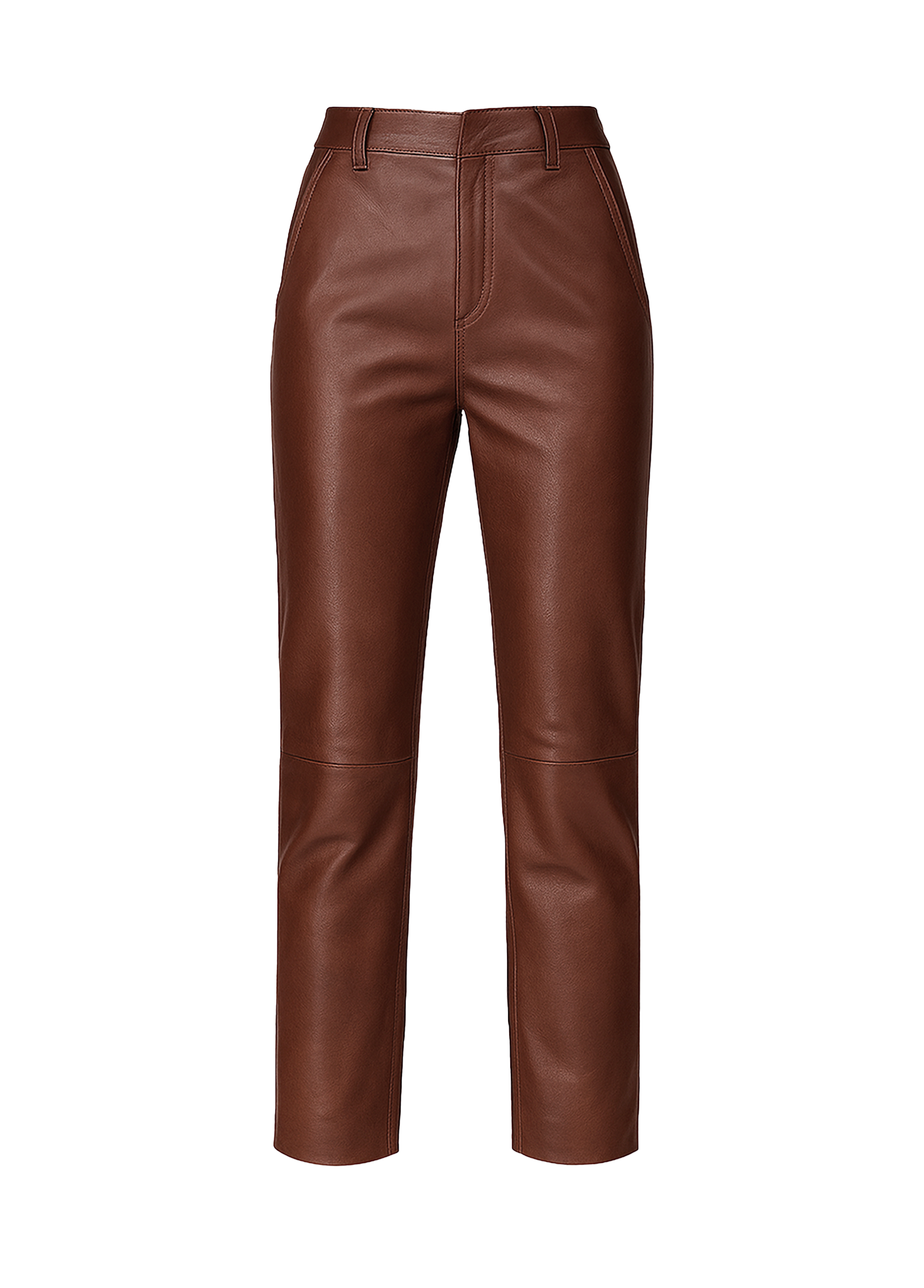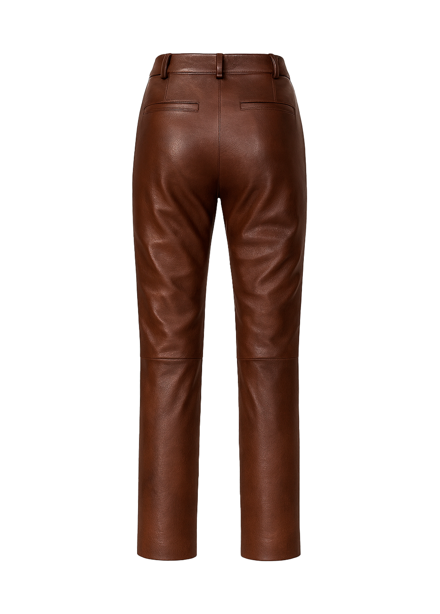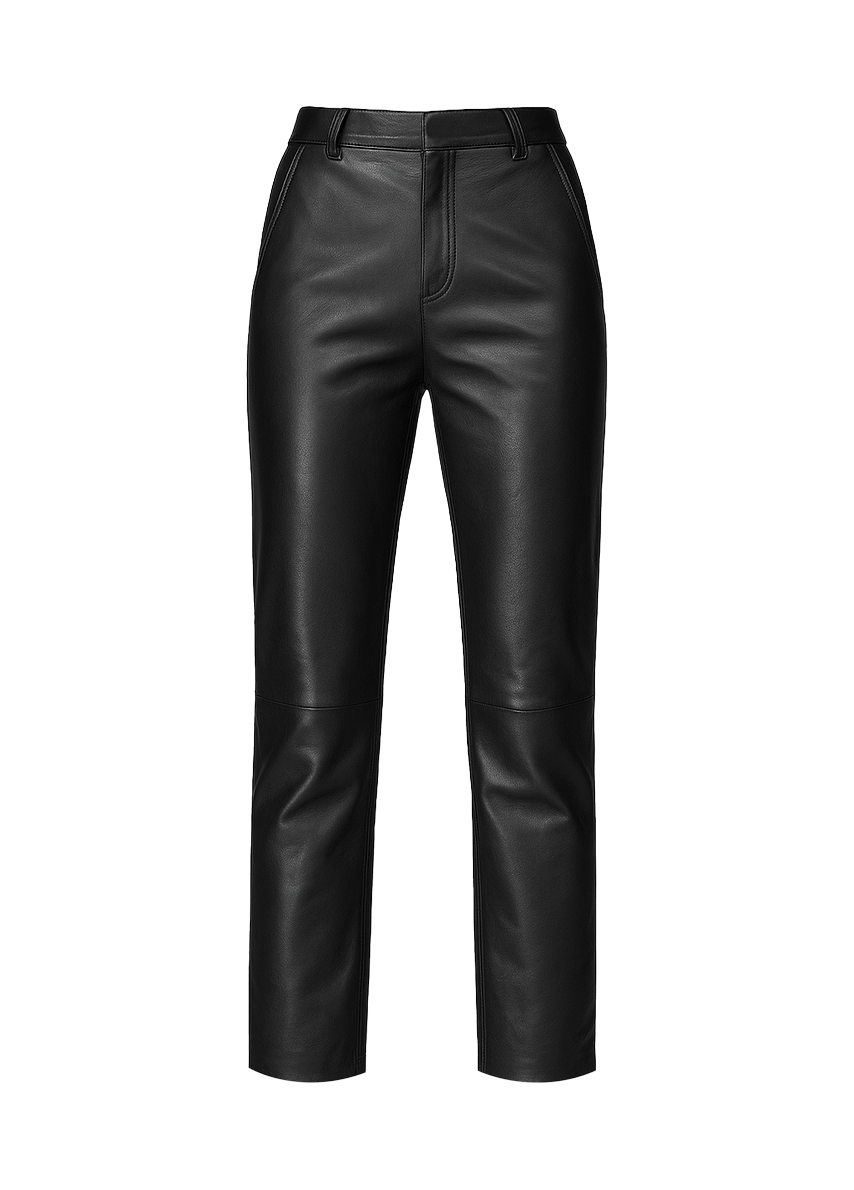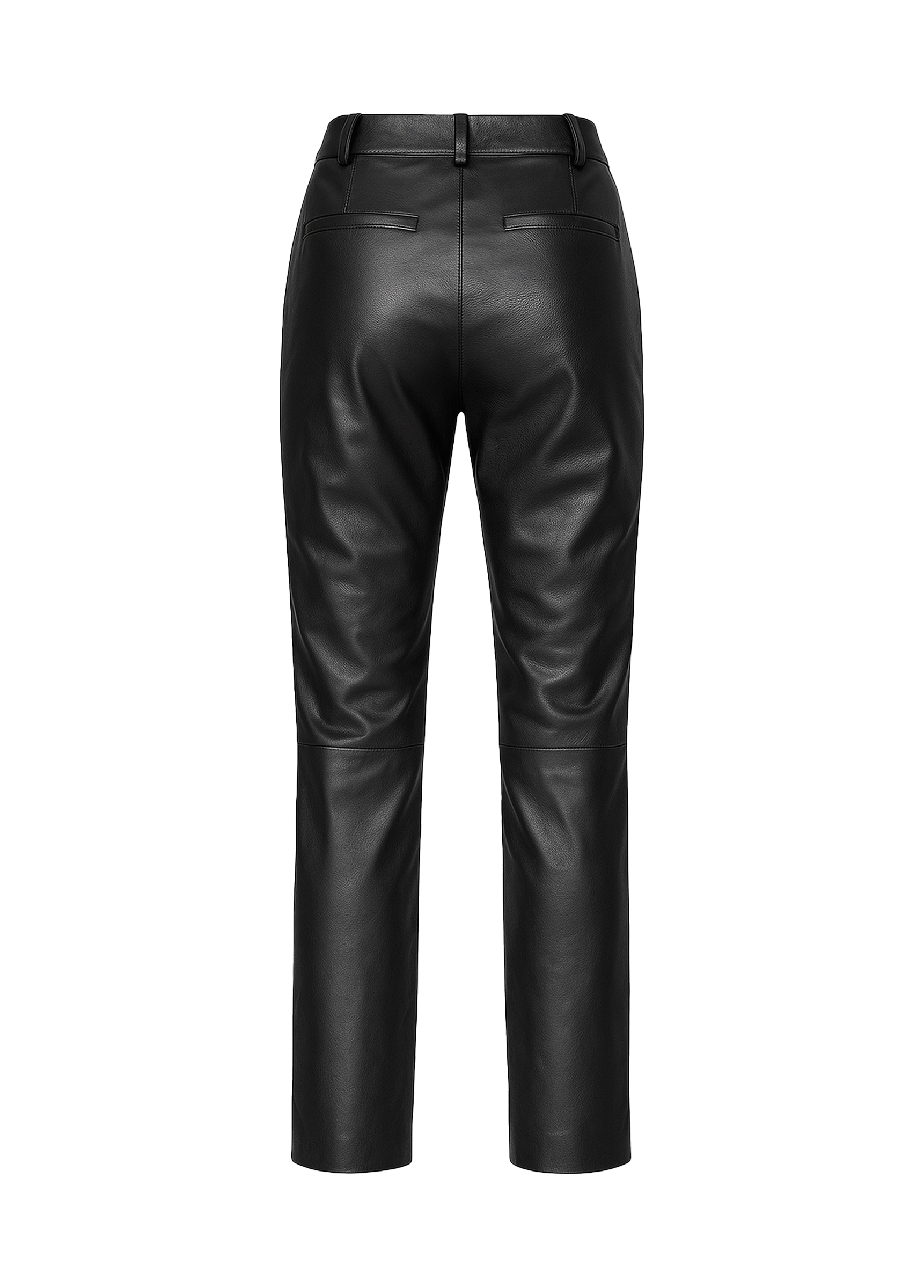 Calça básica de couro com cós, braguilha e bolsos faca.