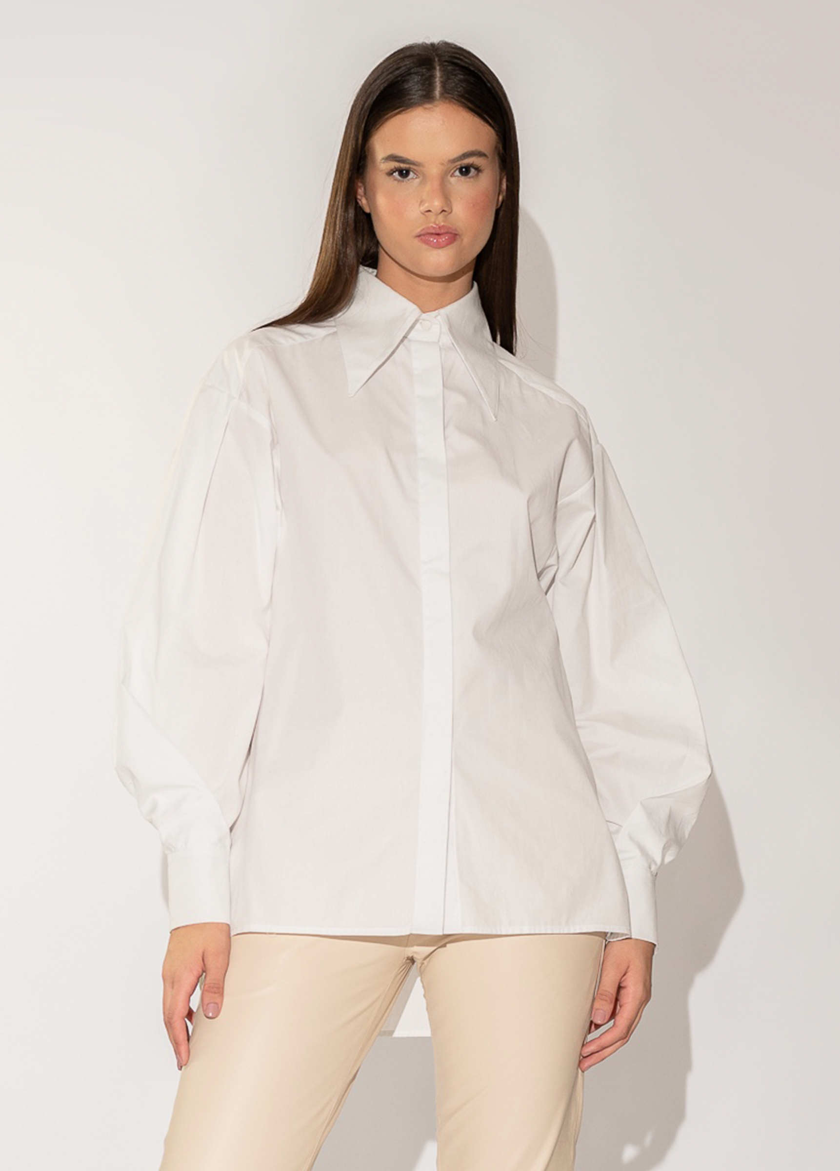 Camisa em tricoline fio egípcio, com punhos abotoados e detalhes franzidos nas mangas, conferindo um estilo bufante. Possui gola pontuda e fechamento com botões.
