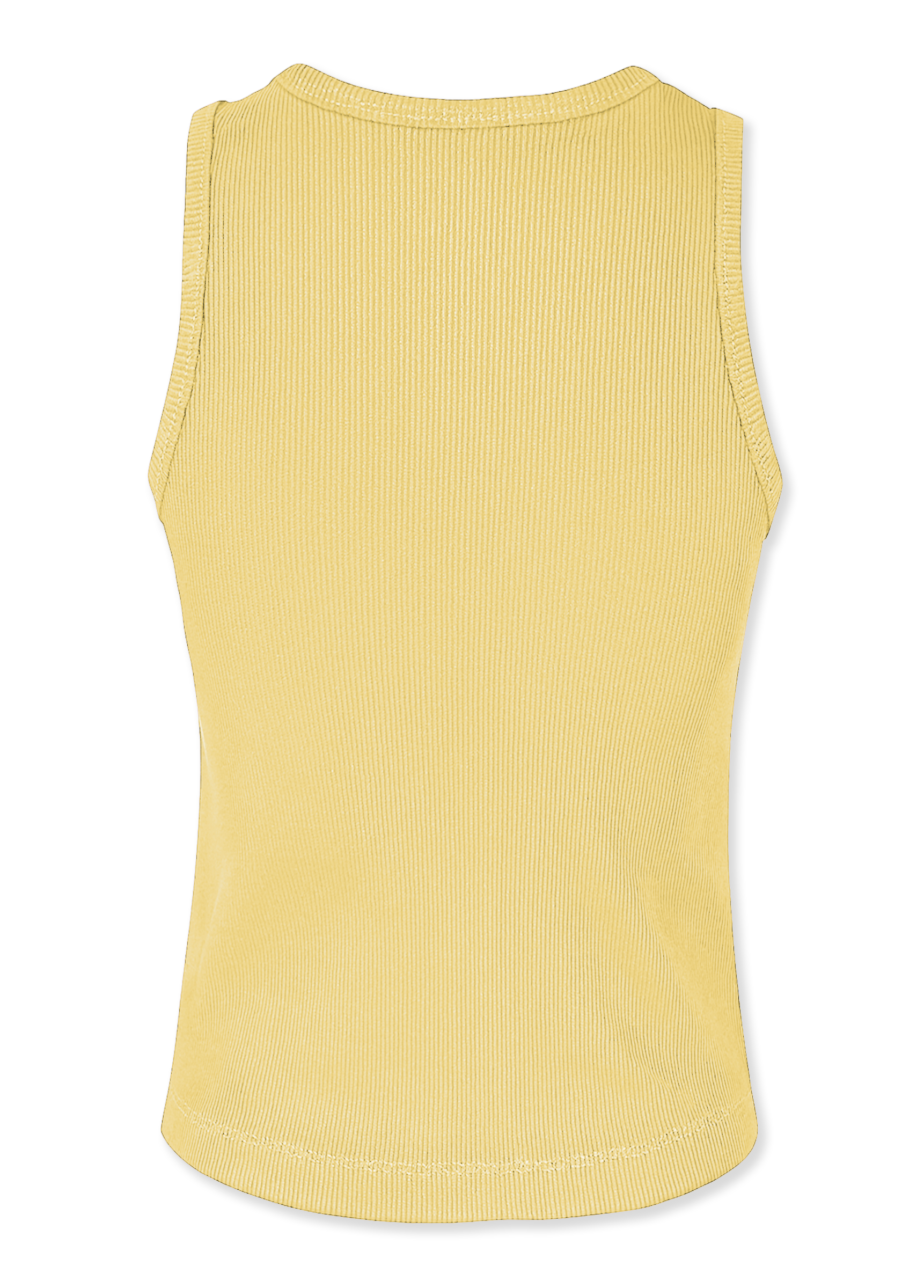 Regata em malha amarela canelada de alta elasticidade com modelagem slim e ajuste ao corpo. Bordado de um coração humano amarelo no centro da peça. Acabamentos reforçados em viés no decote e cavas garantem durabilidade e conforto.